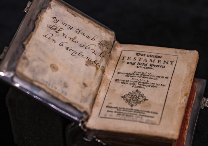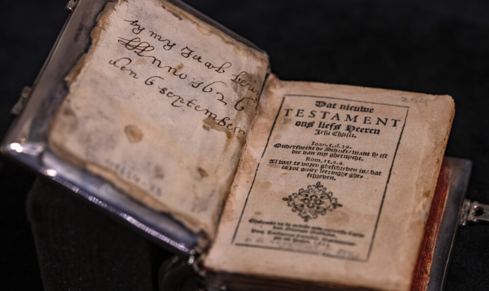 We zijn vereerd dat we als Westfries Museum een bijzonder 17e-eeuws topstuk aan de collectie mogen toevoegen. Een rijk gedecoreerde zilveren boekband met een zeldzame editie van het Nieuwe Testament, in 1623 gedrukt in Hoorn. Van deze bijbel zijn slechts vijf exemplaren bekend, waarvan enkele in veel mindere staat. Boekband en bijbel zijn nog in originele staat en deze bevat zelfs de namen van drie van de 17e-eeuwse eigenaren handgeschreven op het schutblad. Deze zeer welkome aanvulling op de collectie wordt na de renovatie van het museum hét topstuk van het thema ‘Geloof’. Maar voor de sluiting van het museum is de aanwinst nog voor iedereen te bewonderen t/m 1 juni 2025. De aankoop werd mede mogelijk gemaakt door de Vereniging Rembrandt (mede dankzij haar KOG-Vereniging Rembrandt Fonds en haar Mr. J.J.A.M. Kennis Fonds).