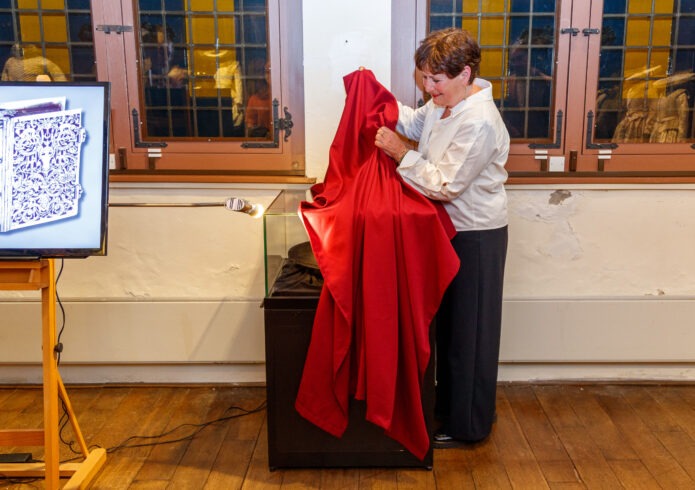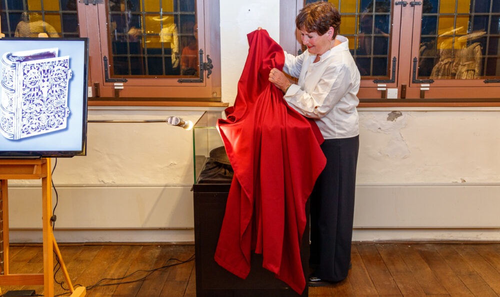 Jenny Verbrugge-Vervoort onthult de Zilveren Bijbel.